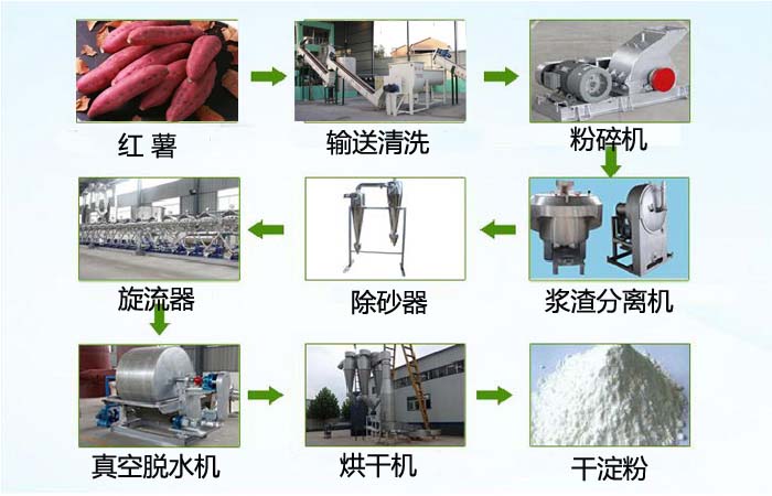 紅薯→(清洗輸送機)→清洗(清洗轉籠)→粉碎(錘片式粉碎機或銼磨機)→漿渣分離(壓力曲篩或離心篩、漿渣分離園篩)→除砂(除砂器)→蛋白纖維分離(碟片分離機、濃縮凈化旋流器機組)→脫水(離心機或真空脫水機)→烘干(低溫低塔氣流對撞淀粉烘干機)→包裝入庫。